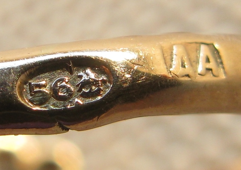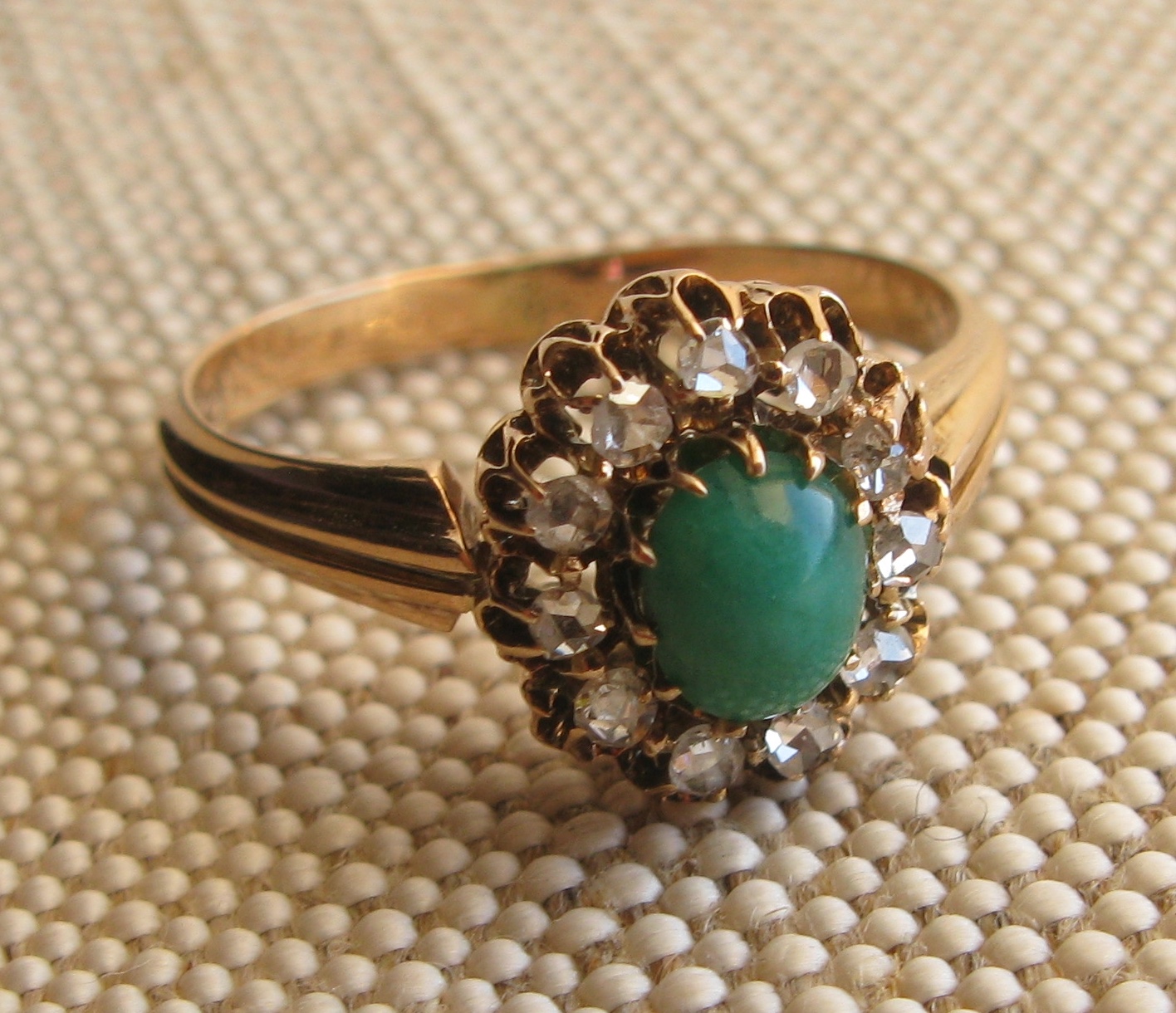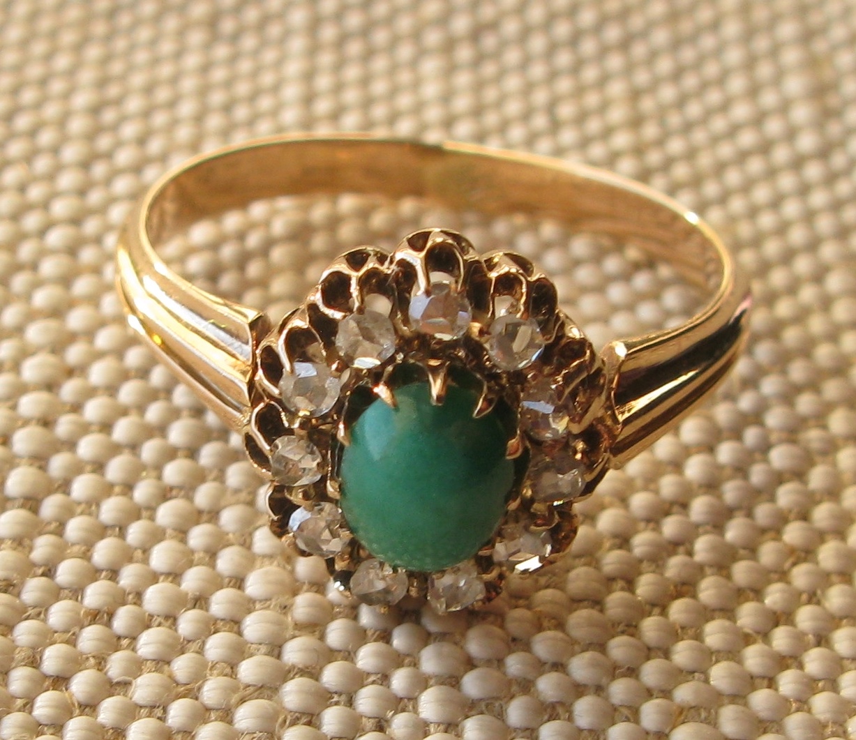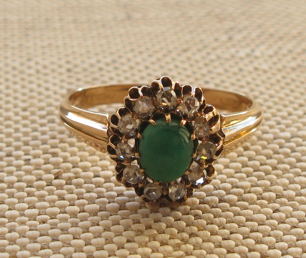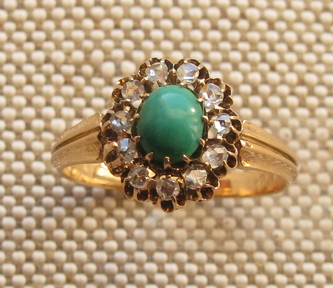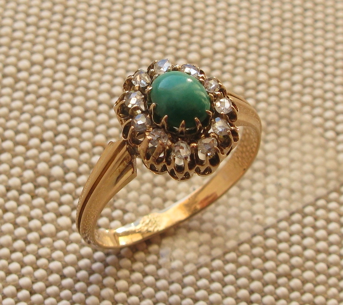 Кольцо антикварное, конец 19 века, Европа, бриллианты, золото 300 проба по спектрометру, клеймо 18 карат, покрытие высокопробным, 2.22 грамма, 16.5 грамм.