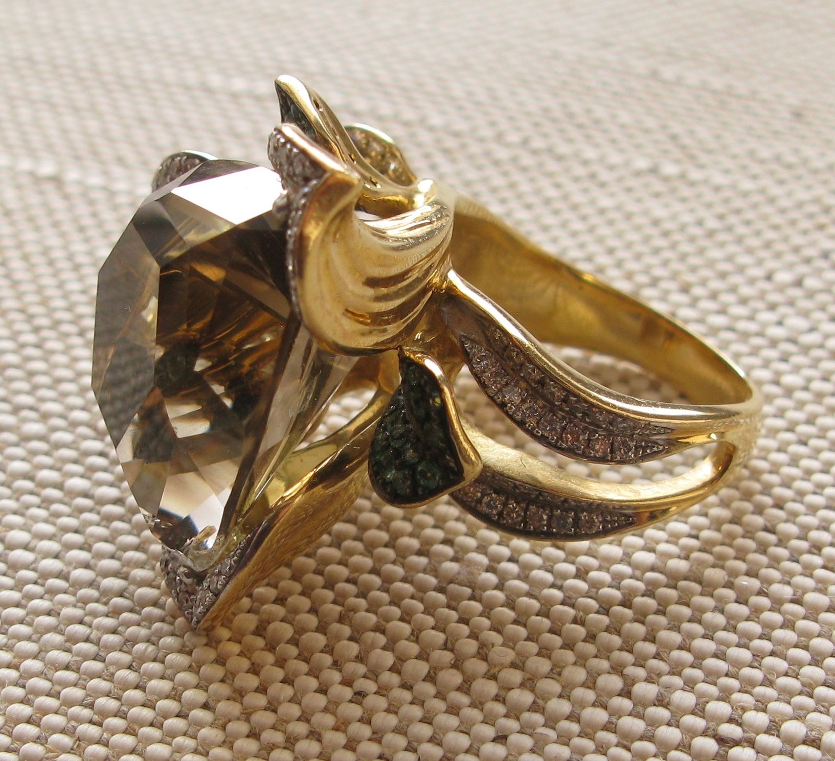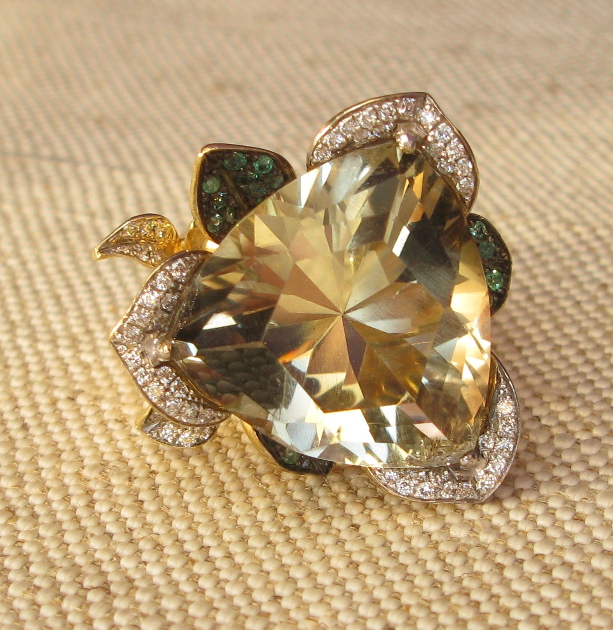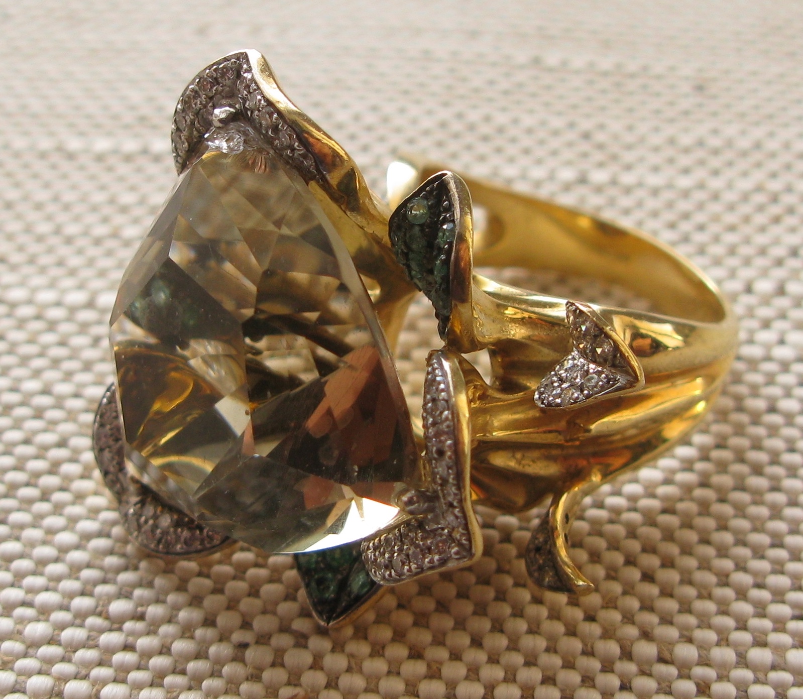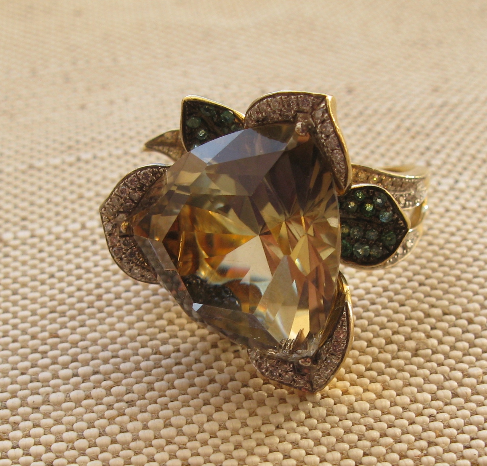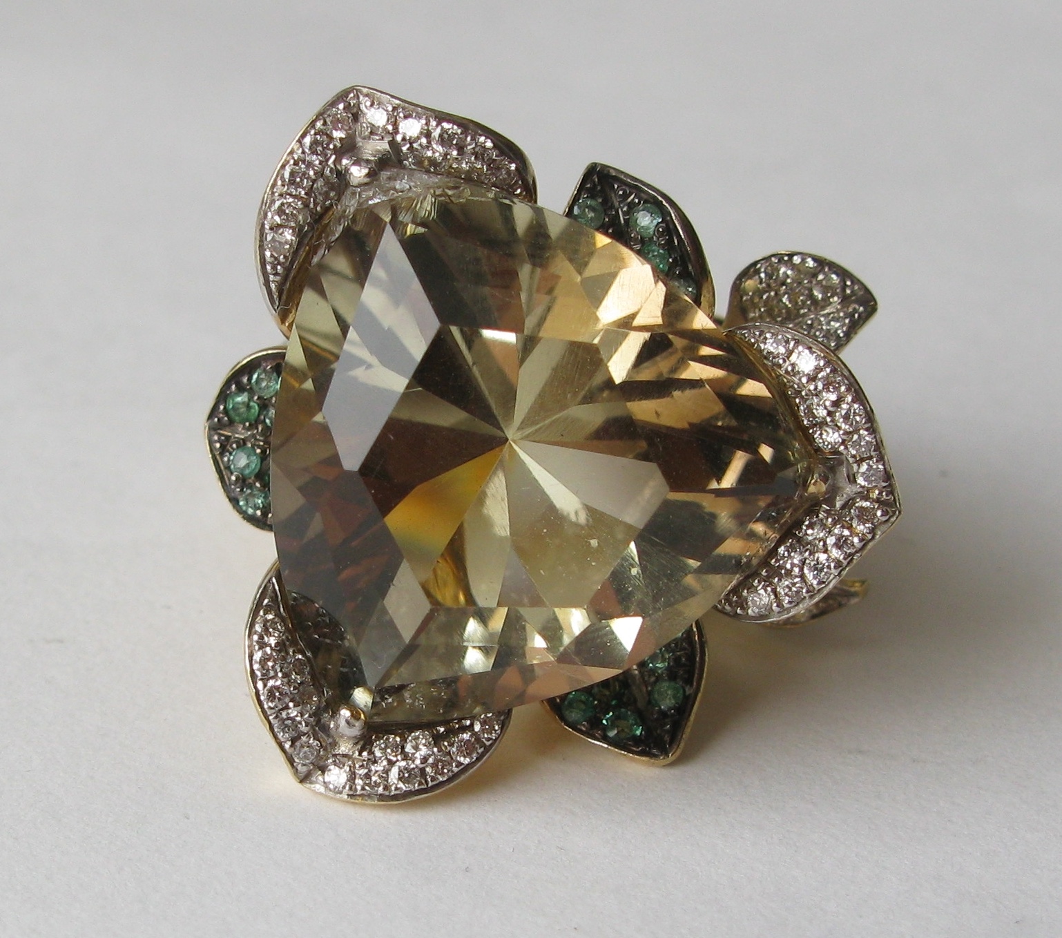 Кольцо, золото 750 проба, изумруды 0.35карата, бриллианты 1.08 карата, цитрин 21 карат, 24.97грамма, 18 размер.