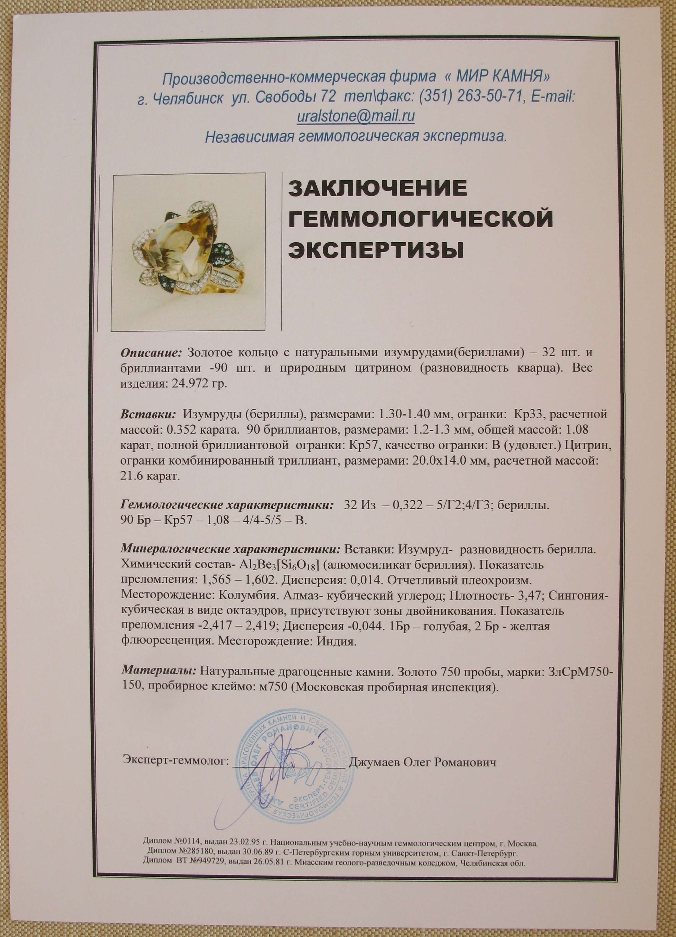 Купить Позвонить: 8 (917) 522-46-34Кольцо, золото 750 проба, изумруды 0.35карата, бриллианты 1.08 карата, цитрин 21 карат, 24.97грамма, 18 размер.маленькая трещиннка под одним крапаном, на фото видно.