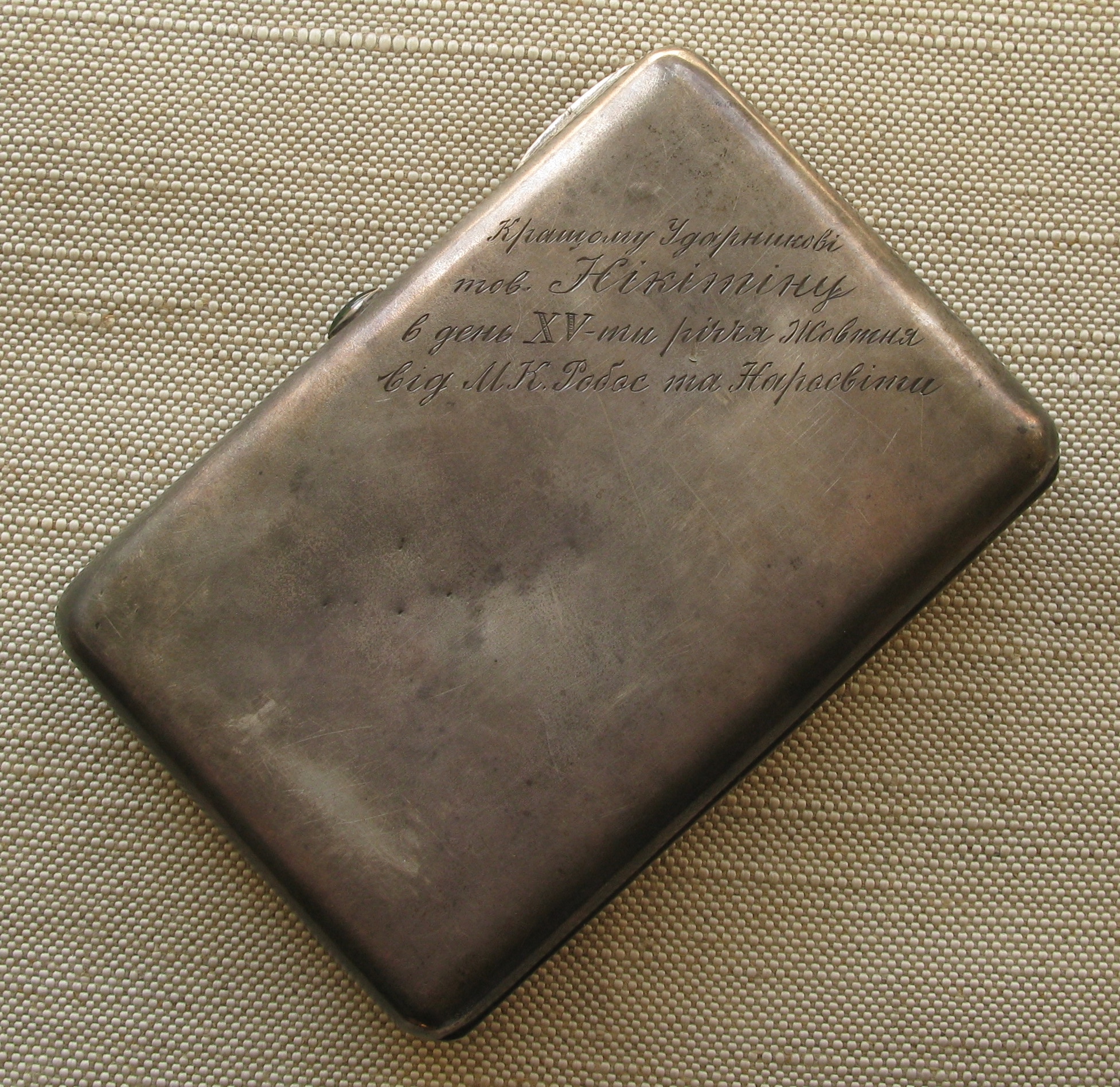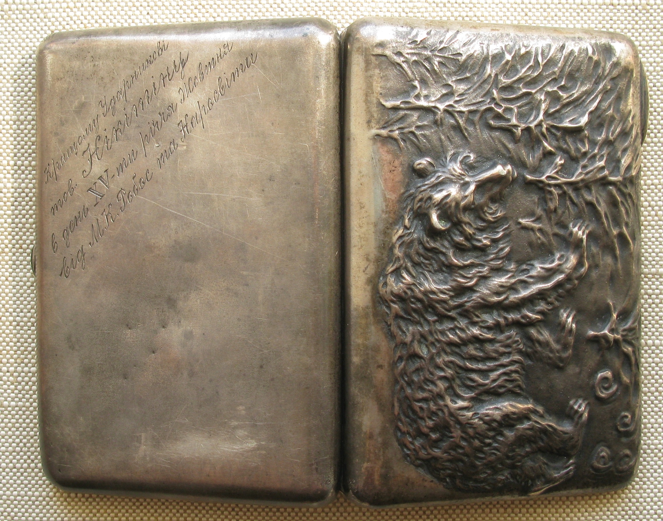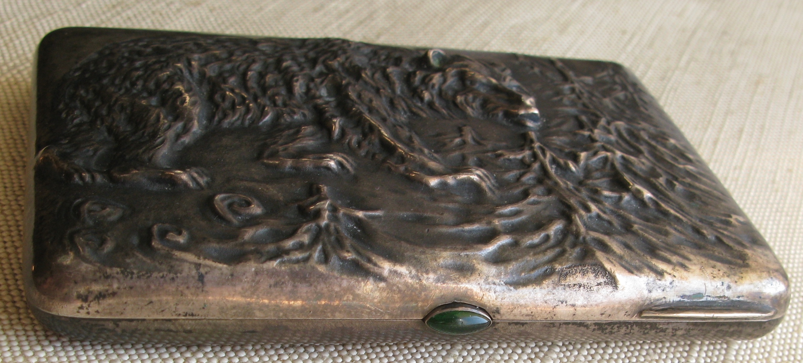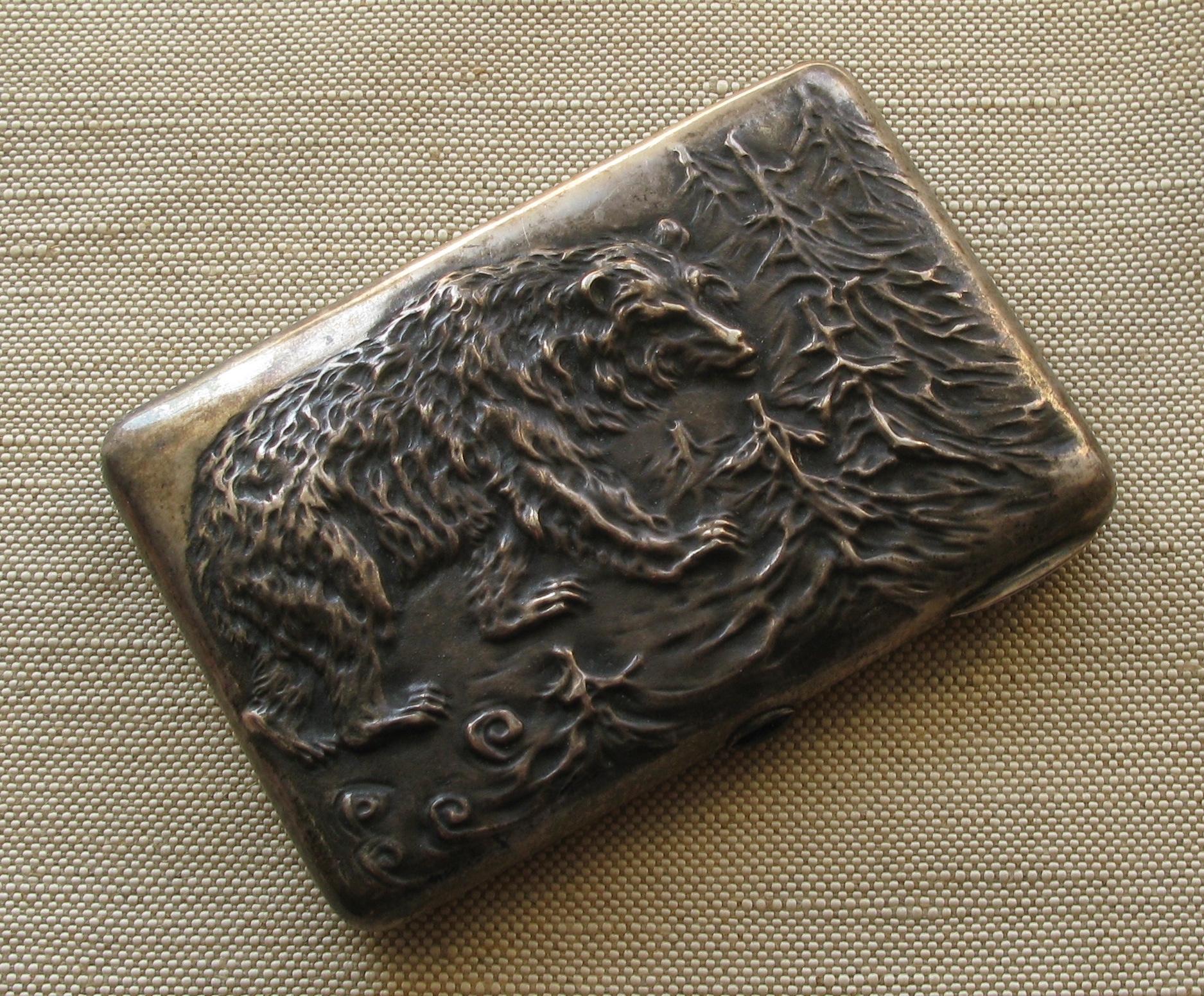 Портсигар, массивный, Медведь, 247 грамм, серебро 84 проба, 115х78мм, Россия, Москва, 1908-1917гг., Прокопий Никитин.
