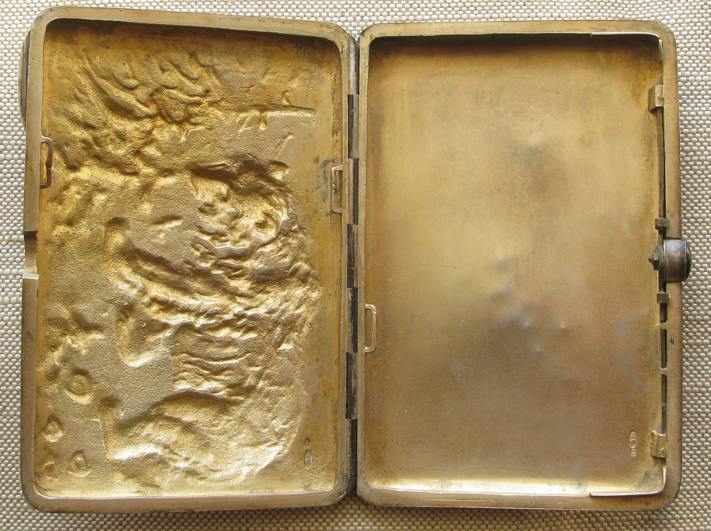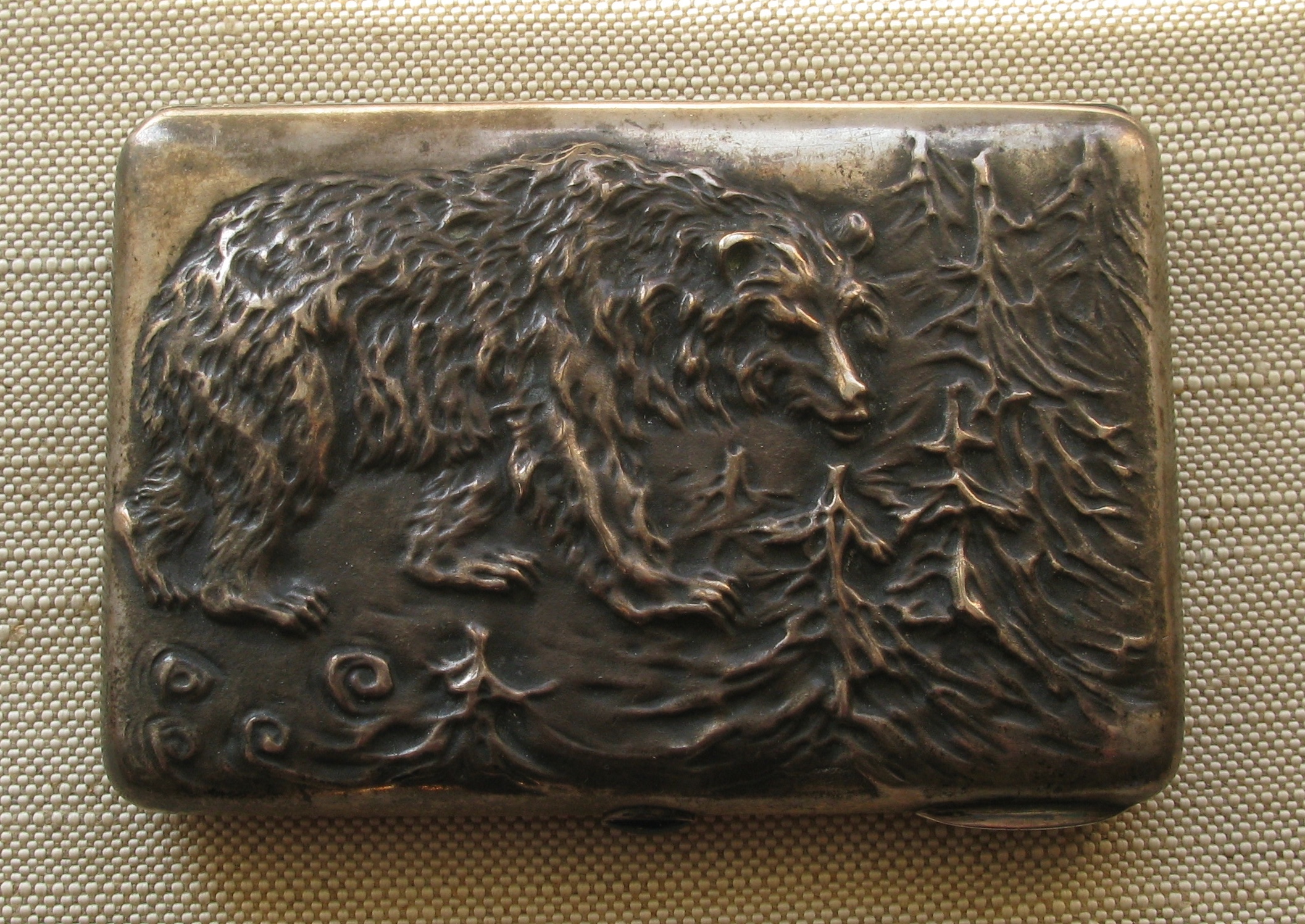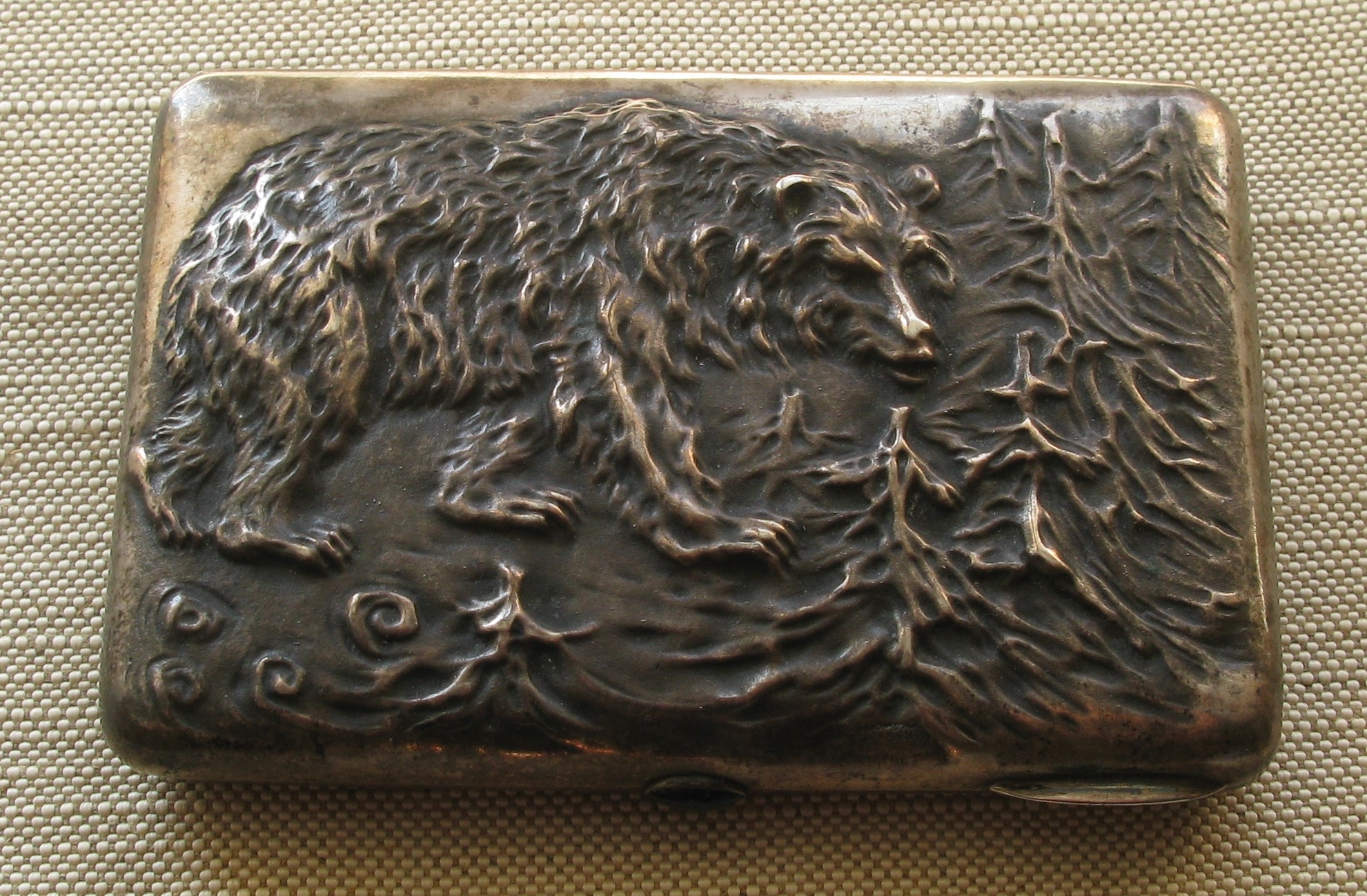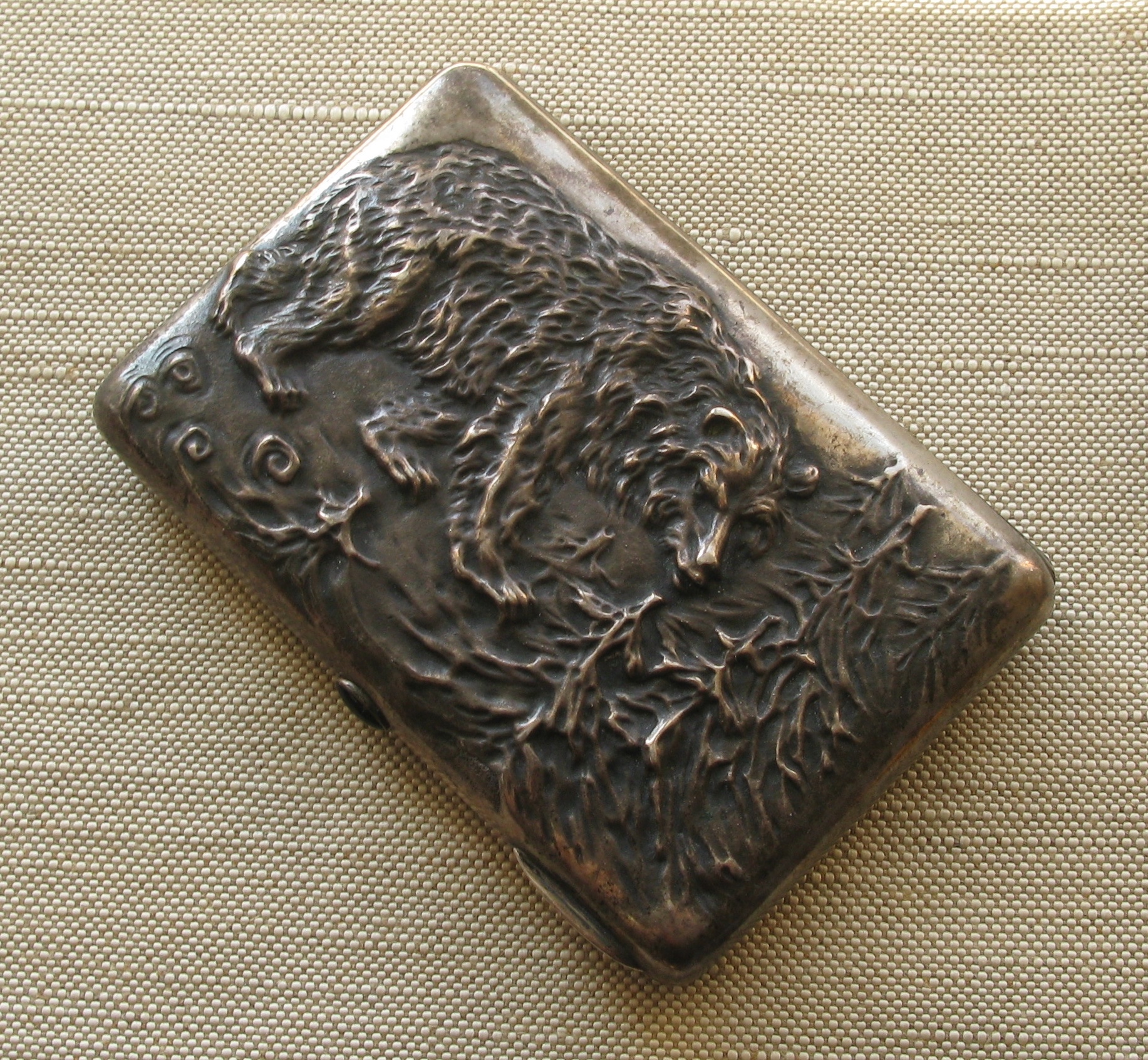 Купить Позвонить: 8 (917) 522-46-34Портсигар, массивный, Медведь, 247 грамм, серебро 84 проба, 115х78мм, Россия, Москва, 1908-1917гг., Прокопий Никитин.